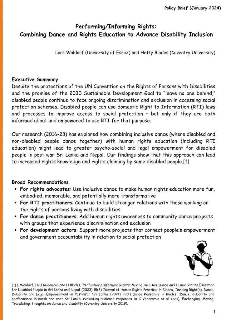 Lars Waldorf and Hetty Blades, ‘Performing/Informing Rights: Combining Dance and Rights Education to Advance Disability Inclusion’ (Policy Brief 2024). DOI: 10.5526/60wy-1p19